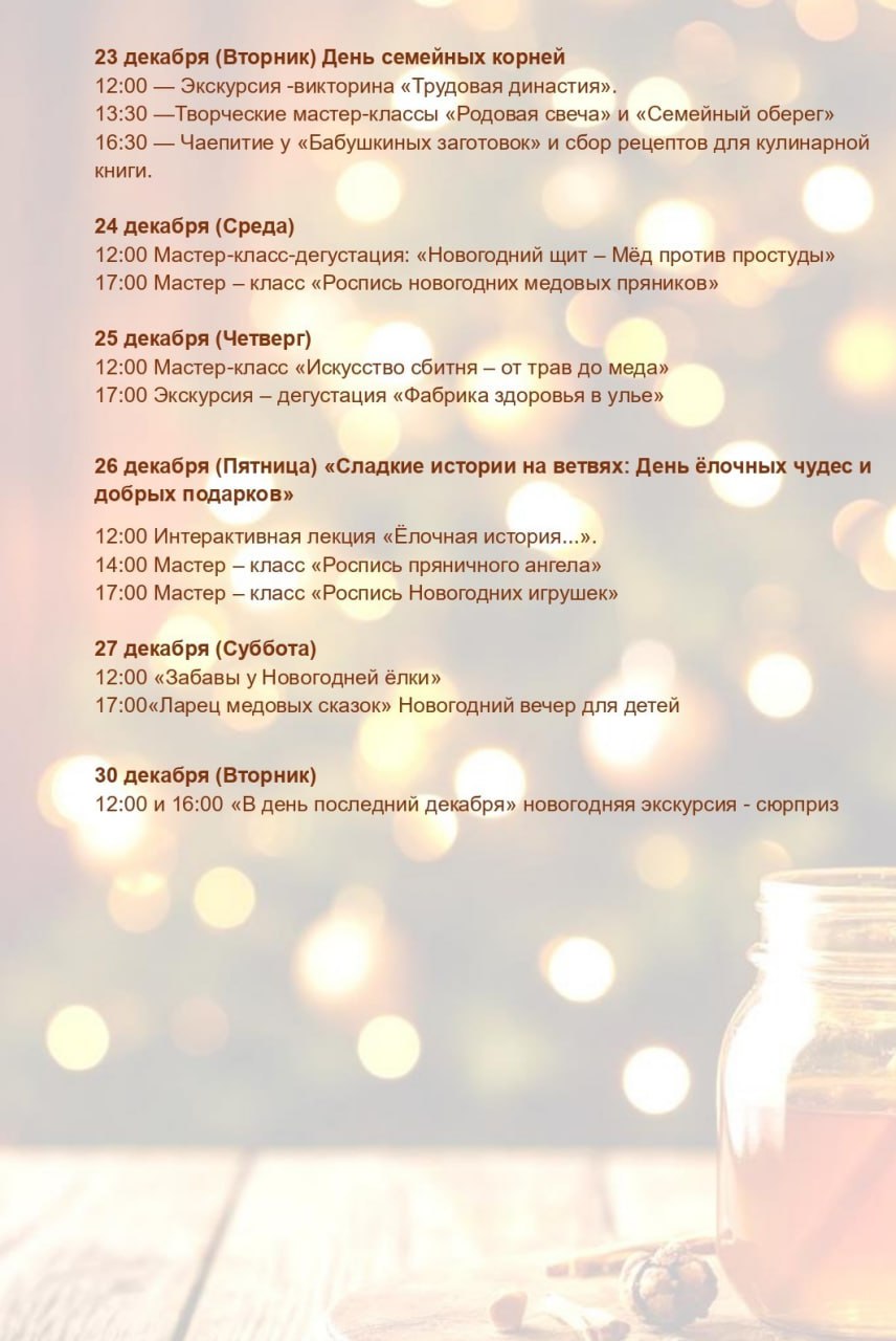 Друзья, мы подготовили для вас насыщенную программу на декабрь! В нашем музее меда «Пчелотека» вас ждут увлекательные экскурсии, творческие мастер-классы и, конечно, знакомство с удивительным миром пчел.